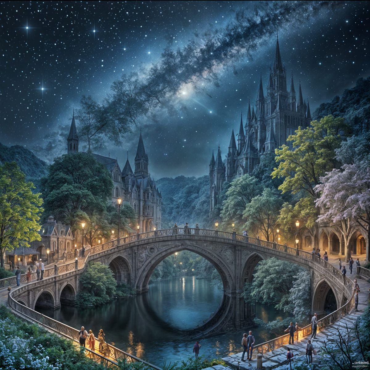 A striking picture of a fantasy city nestled in giant trees, bathed in multicolored light from distant galaxies. The image evokes magical realism in a detailed, atmospheric matte painting style.