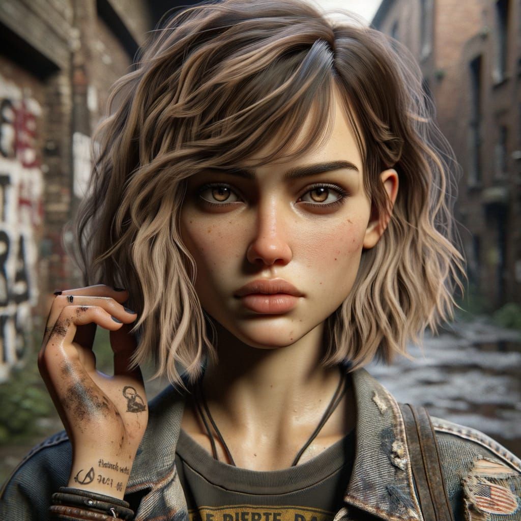 This image shows a photorealistic portrait of a young woman in an urban setting. The scene features moody lighting, graffiti art, and cinematic tones, capturing a determined expression.