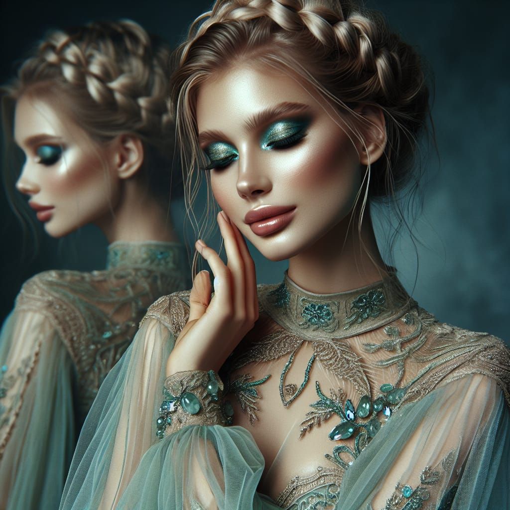 This image shows a serene goddess radiating peace and tranquility. She wears a celadon gown and bohemian variscite jewelry, depicted with intricate details in the style of a digital matte painting.