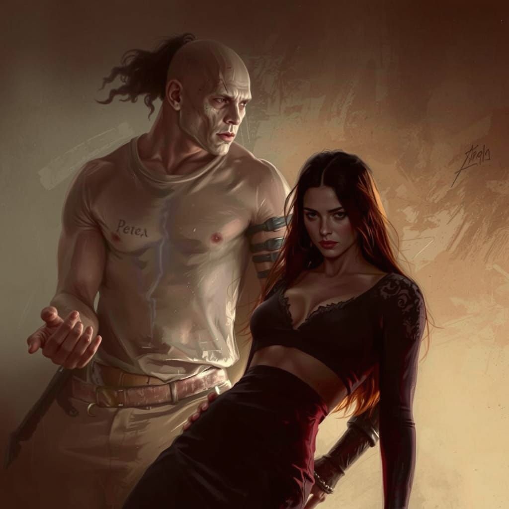 A sinister image shows a woman in black standing next to a muscular figure. It has a dark, paranormal aesthetic.