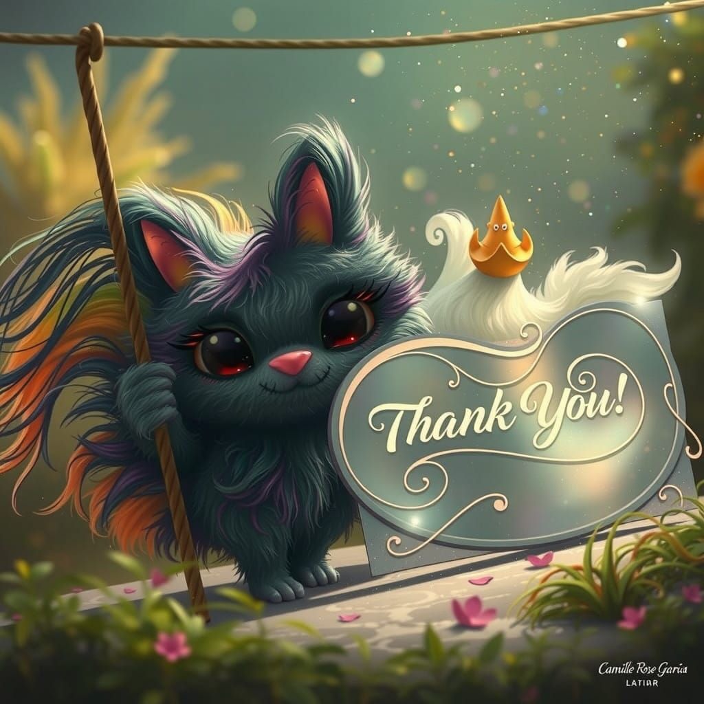 A whimsical digital artwork of a big-eyed, pastel rainbow creature holding a 'Thank You!' sign. The image features soft gradients and shimmering accents, in a dreamy, textured style.