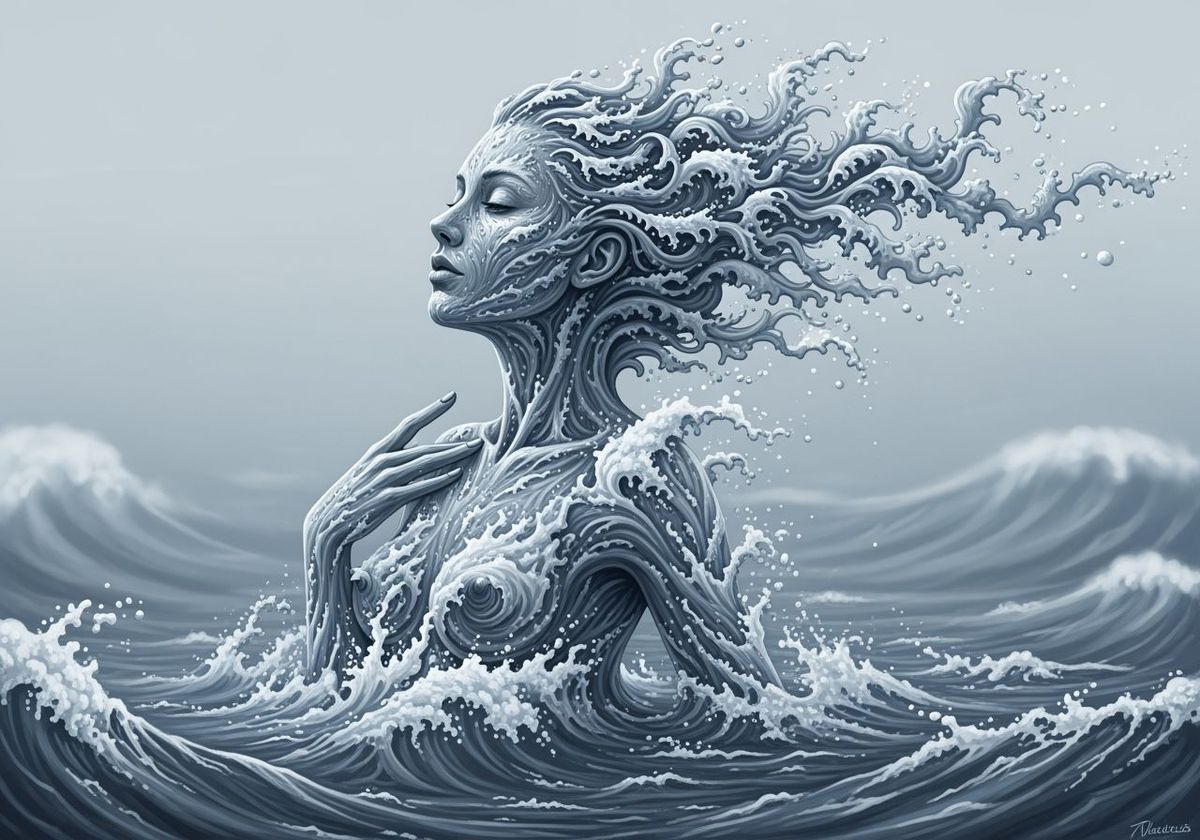 A detailed portrait of a delicate woman formed from sea foam, emerging from a turbulent ocean. Her form blends into the slate blue water, leaving a surreal, ethereal impression.