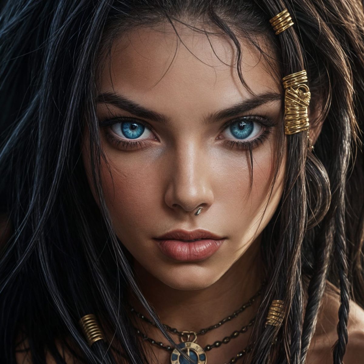 A hyper-realistic digital painting of a young woman with realistic skin. nose ring. Purple makeup runs from her left eye, wavy dark. Dreadlocks brown hair. The artwork has a soft, smooth shading technique that enhances the photorealistic details of her face. Her eyes are blue with an intense gaze, and her makeup features bold, vibrant mocha eyeshadow and glossy red lips, creating a dramatic contrast against the skin tones of her skin and hair. The lighting is soft and diffused, accentuating the smoothness of her skin with subtle highlights and shadows. The background is white, keeping the focus on her captivating expression. The overall mood is mysterious and elegant, with a gothic or noir-inspired aesthetic.