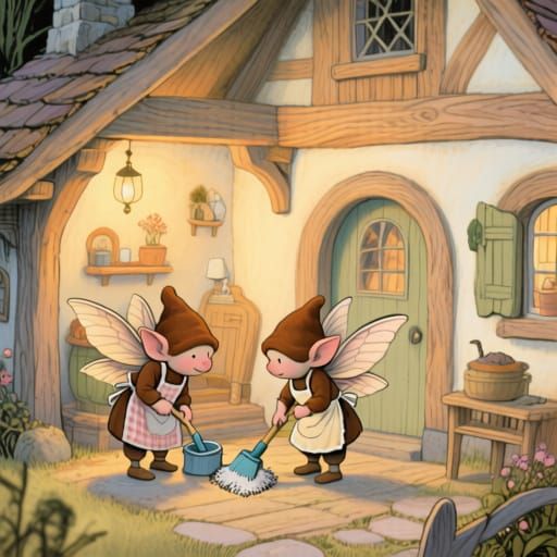 This illustration shows tiny winged brownies tidying a cozy human cottage. The charming scene features warm lighting and soft colors, evoking a storybook fantasy.
