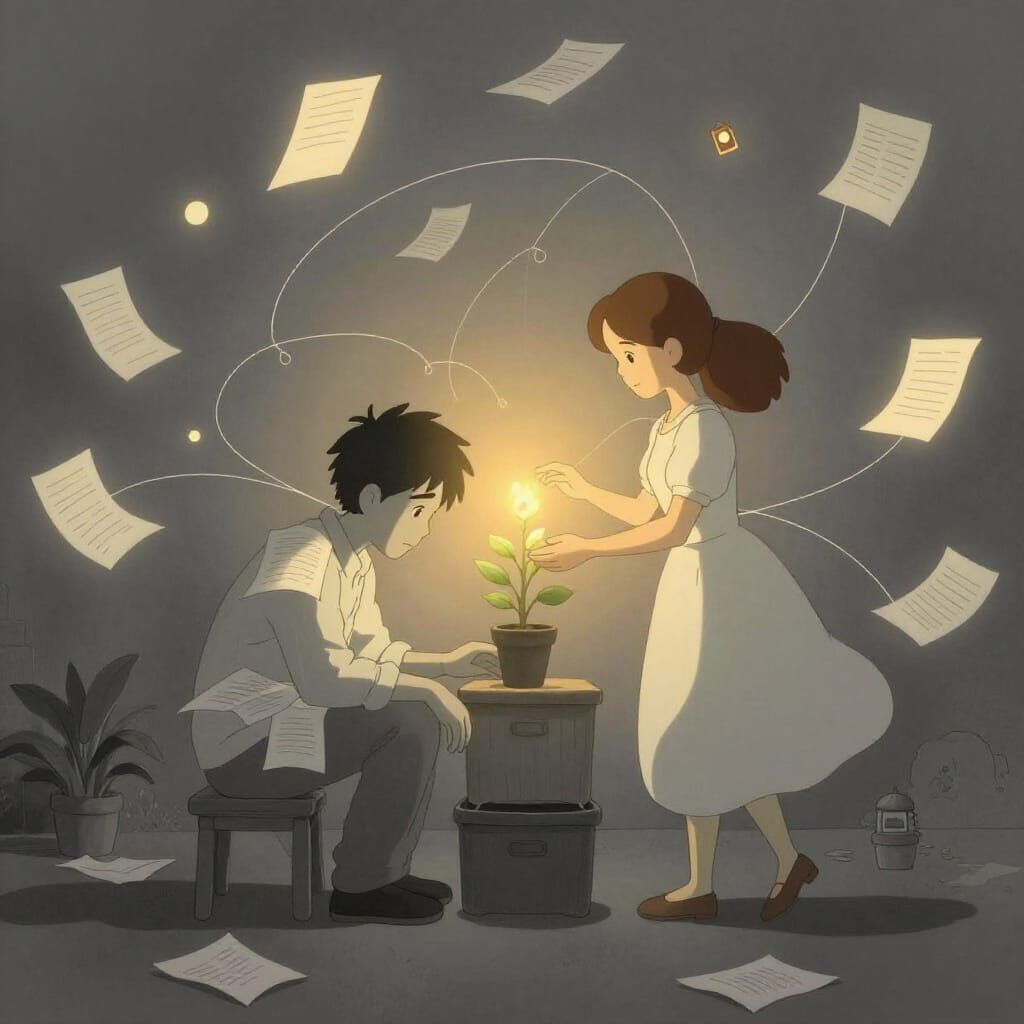 A stylized animation of a couple facing daily struggles. Amidst a muted environment, their connection shines through a warm golden light, symbolizing love and resilience.