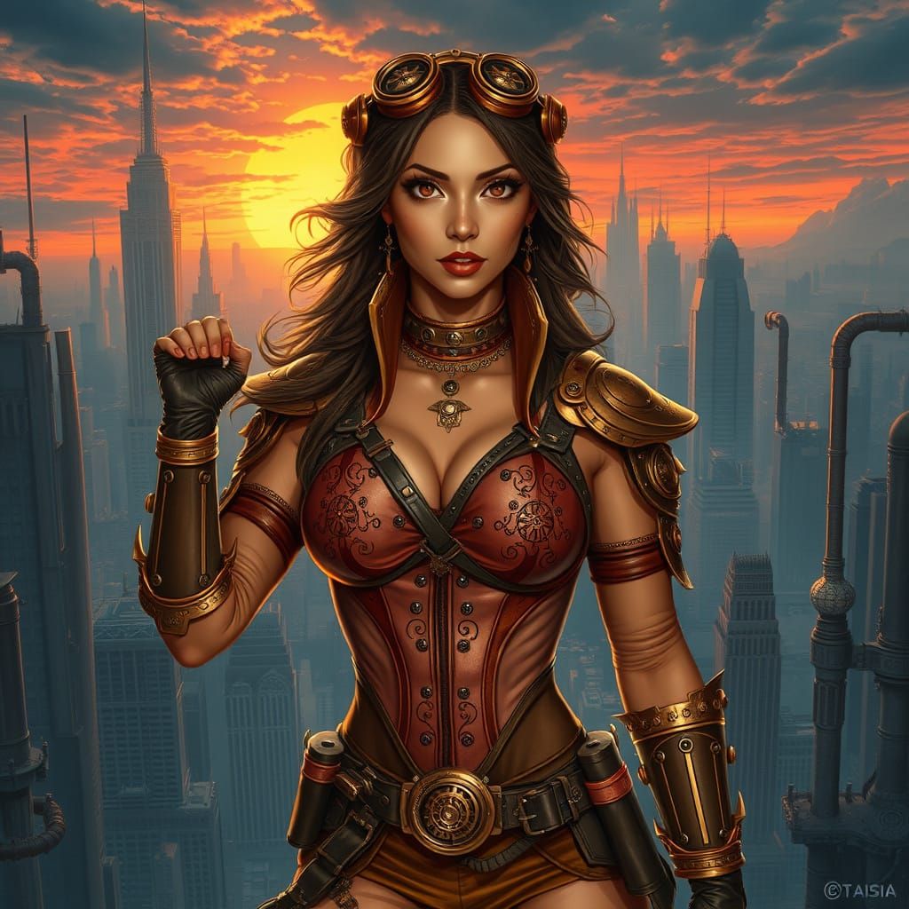 This image depicts a tan female superhero in a detailed steampunk costume, standing heroically amidst a futuristic city backdrop with towering skyscrapers and a deep, fiery sunset, rendered in a rich, matte painting style with subtle texture.