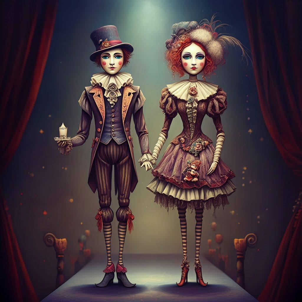 This image features a romantic puppet couple with long legs and unusual heads, dressed in velvet and wool. The art combines surreal, romantic, and scary elements with vivid, dreamlike lighting.