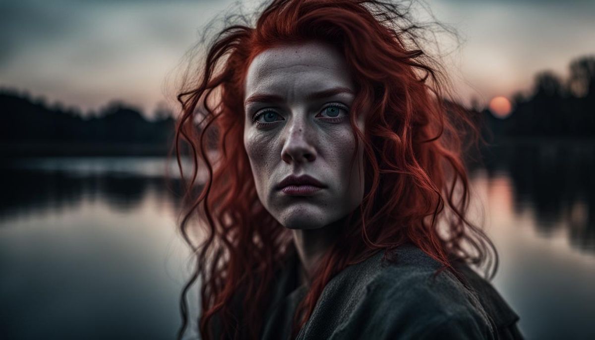 This image shows a red-haired woman with an angelic face posing in a bikini by a moonlit lake. The close-up portrait is lit by ambient light.