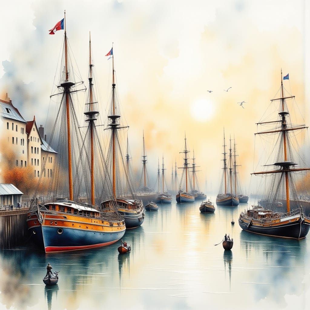 This image shows a serene and idyllic harbor scene, captured in soft watercolor hues with delicate brushstrokes and blended colors, evoking the classic style of Turner and the whimsy of Loish's expressive freedom.