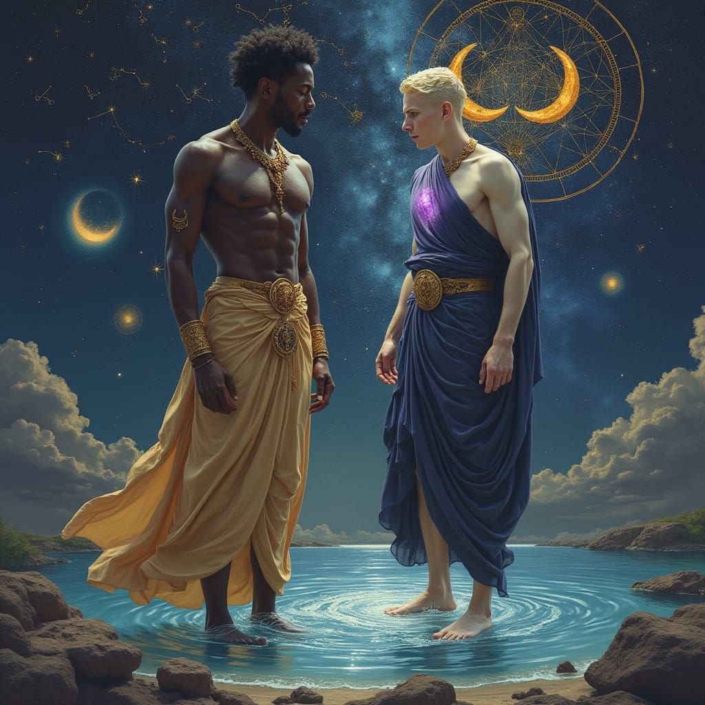 This image shows two men in a celestial landscape under a nebula sky. The artwork features sacred geometry, constellation details, and a vibrant color palette in an atmospheric style.