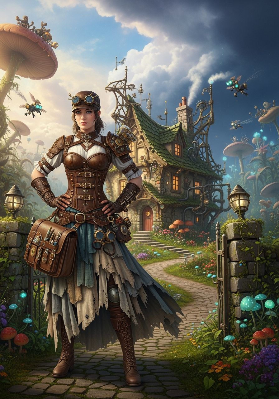 A steampunk warrior stands before a quaint cottage with fantastical gardens. Her attire includes a leather corset, flowing skirt, and goggles. The scene blends industrial design with whimsical natural elements.