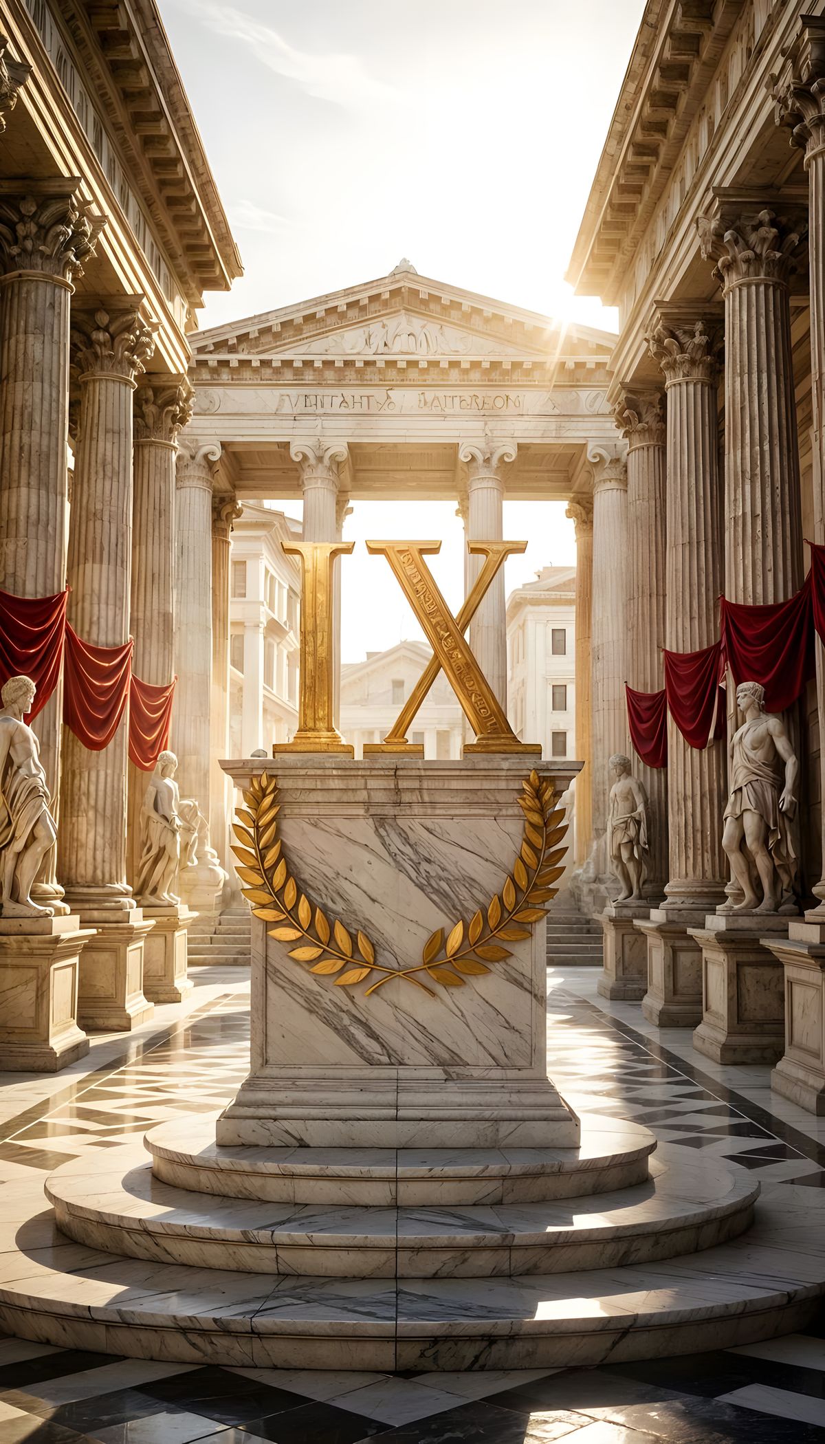 This image shows the Roman numeral IX carved in marble within a majestic Roman forum. Golden sunlight illuminates the scene, creating a timeless atmosphere reminiscent of the Roman Empire's glory. Cinematic film style.