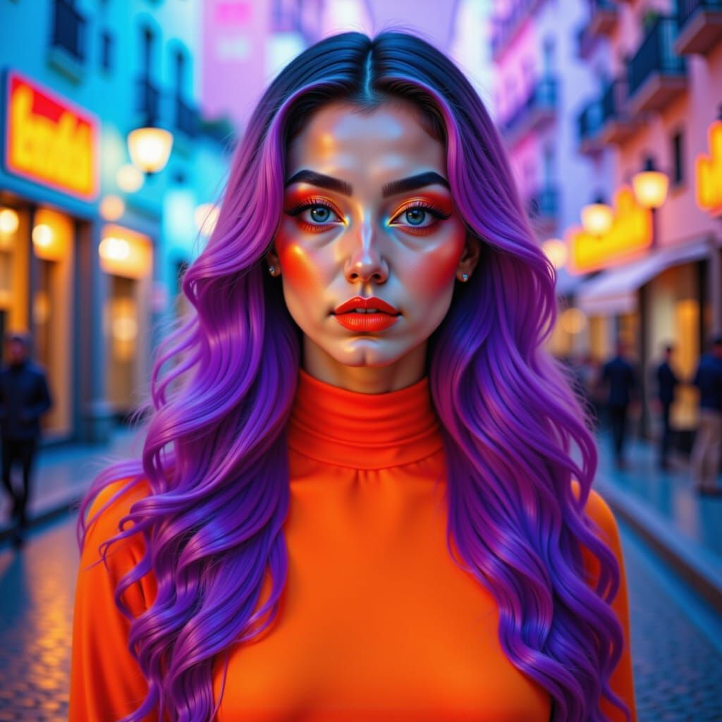 <lora:Atmospheria:1.0> <lora:Editorial:1.0> <lora:Radiant Portraiture:1.0> <lora:Makeup In Color:1.0> An editorial portrait of a woman with long wavy purple hair, striking orange eyeshadow, and vivid fuchsia lips. Sophisticated and polished, she radiates timeless glamour. The streets of Spain glow behind ...