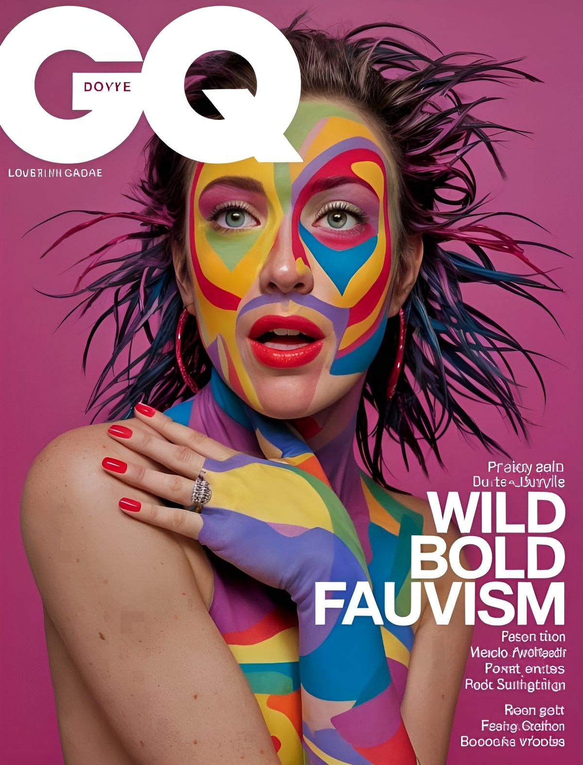 This image showcases a bold and vibrant portrait in the style of Fauvism, reminiscent of a high-end fashion magazine cover.