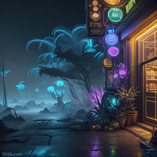 This image shows an otherworldly shop on an alien world, showcasing bizarre items for sale. The vibrant digital art features intricate textures, neon lights, and iridescent plants, all rendered in deep, contrasting colors.