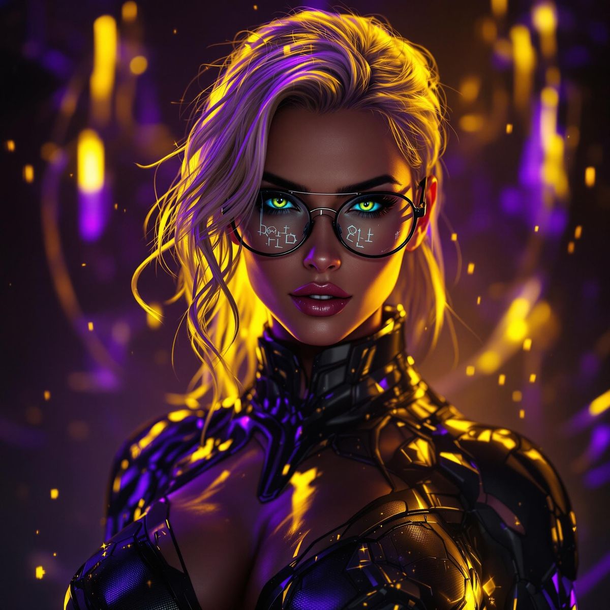 A digital painting of a strong blonde woman with green eyes, wearing glasses and a bodysuit. The artwork features dynamic lighting and rich colors in a dark fantasy aesthetic.