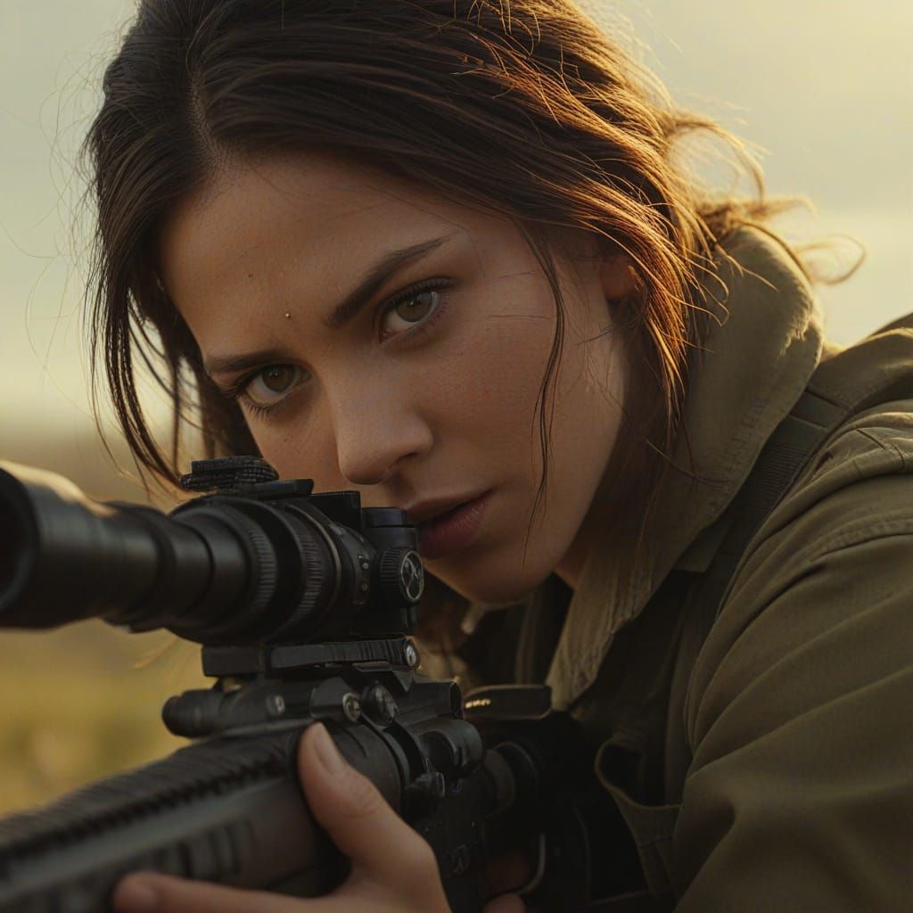 A striking picture of a caterpillar sniper after a successful shot. The image is cinematic, with warm color grading, soft film grain, and atmospheric mist.