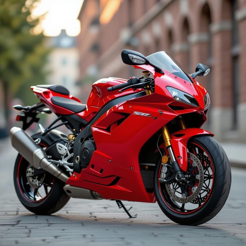 This image shows a glossy red sports motorcycle with a sleek, aerodynamic design and polished chrome accents. Captured with cinematic lighting and a shallow depth of field, it evokes automotive photography.