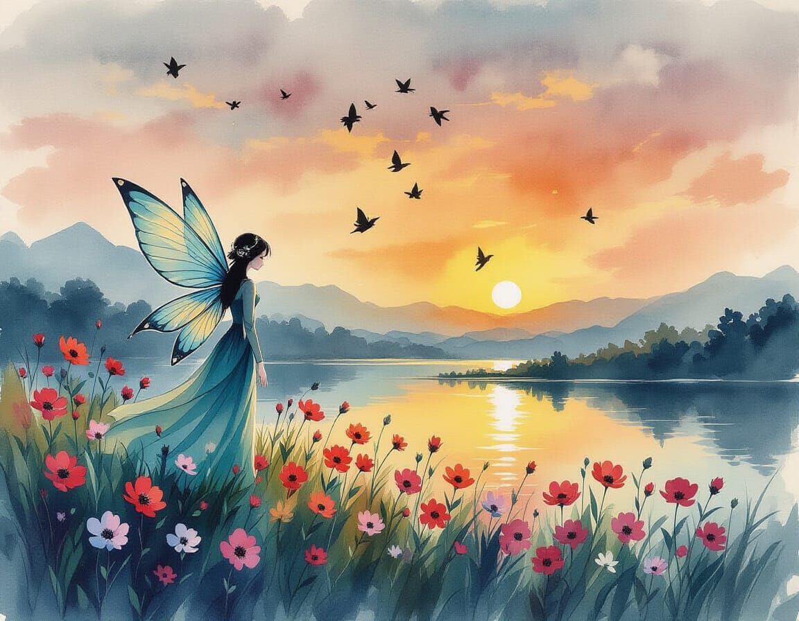 This image shows steampunk fairies with wings flitting around a flower-filled meadow beside a lake at sunset. The scene is rendered in a traditional Chinese ink painting style.
