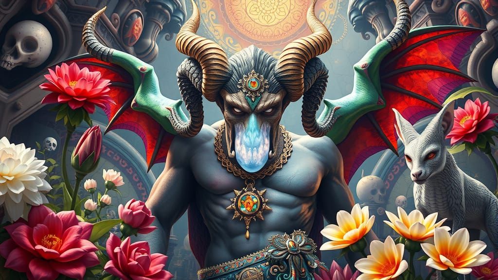 A surreal scene shows demons interacting with exotic flora and fauna. The scene features intricate architecture and a dark, mystical atmosphere with biomechanical elements and an eerie, dreamlike quality.