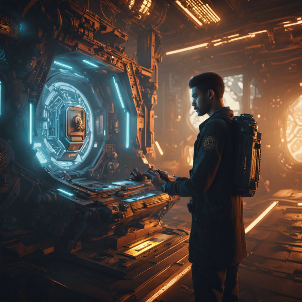 This image shows a young archeologist with a cybernetic eye examining a relic in a futuristic chamber. The digital matte painting features neon accents and warm golden tones, with cinematic lighting and subtle lens flares in a cyberpunk aesthetic.