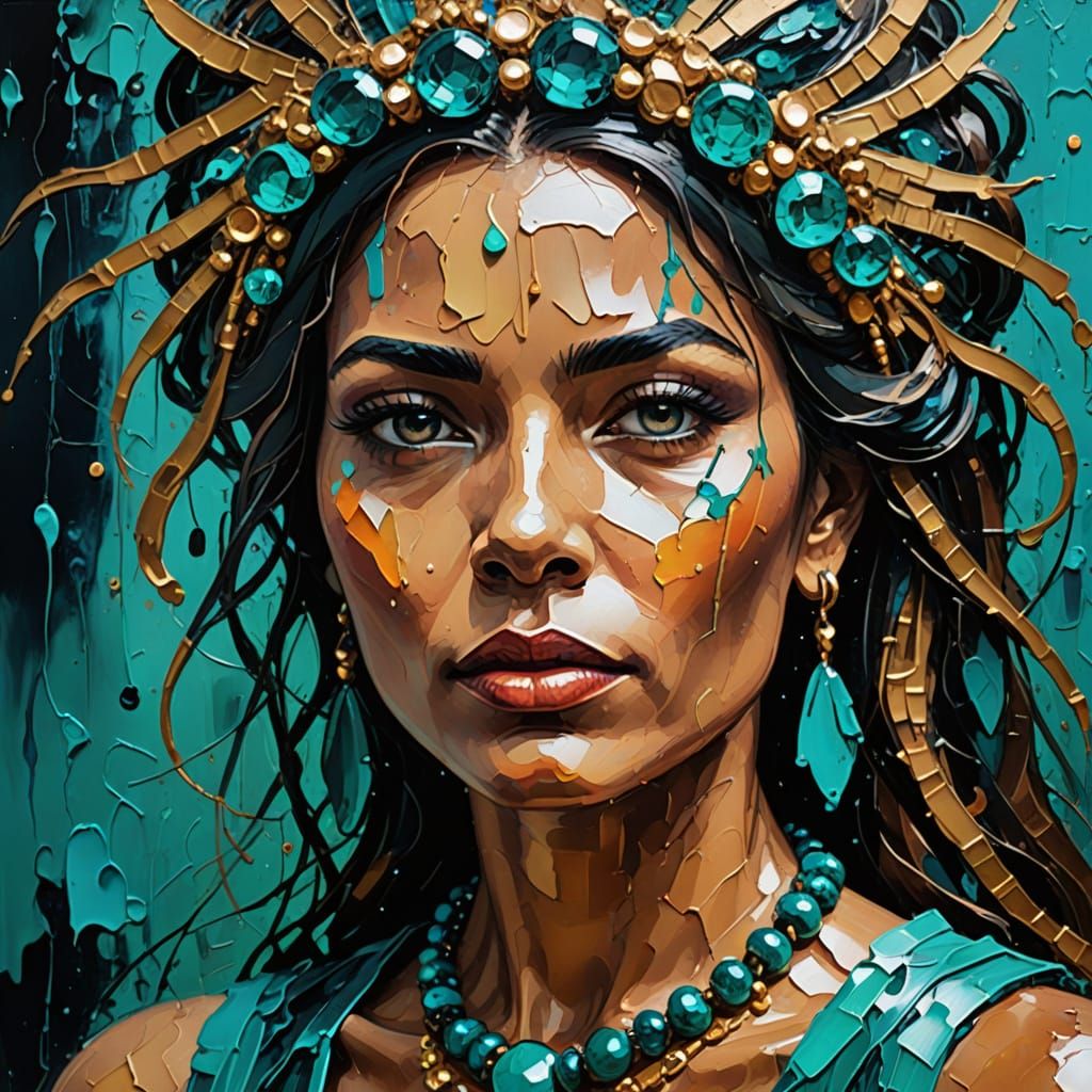 This image showcases a close-up of a majestic woman adorned with beads and elaborate jewelry, set against a dark and moody background with golden accents and vibrant teal and bronze bioluminescent accents, rendered in thick, expressive brushstrokes as a high-quality fantasy art piece