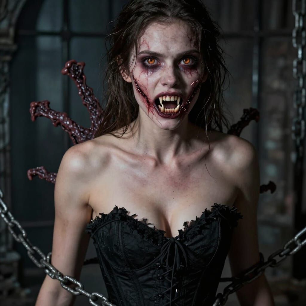 This hyper-photorealistic image shows a terrifyingly transformed young woman with dark fibrous growths and predatory jaws. Bound by chains in a dungeon, her eyes fix threateningly on the viewer.