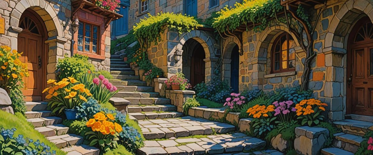 A whimsical village scene featuring stone steps and benches, rendered in vibrant watercolors and gouache. The artwork presents a comic book aesthetic with bright sunlight and volumetric lighting.