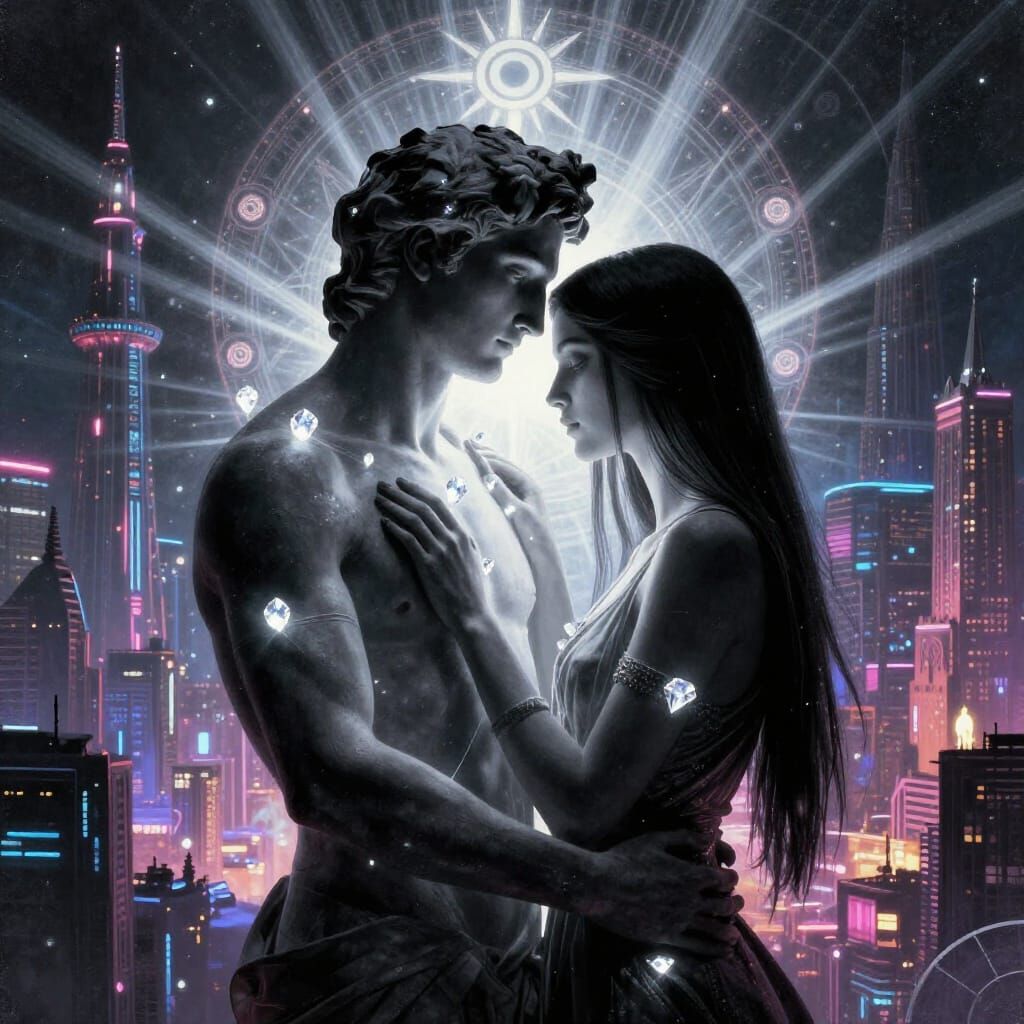 michelangelo paintings style : statue guy in glowing crystal diamonds with enlaced beautiful armenian woman with ultra straight hair, shy, couple very connected spiritual, only bicromic, silouette, city of shamballah in background with, third eye chakra,, ray of lights between characters, ultra deep ...
