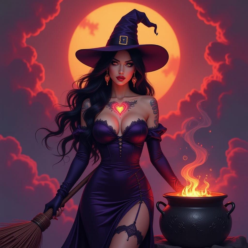 This image shows a breathtakingly beautiful Venus as a Goth Goddess, wearing a witch hat and holding a broom. She poses seductively with glowing heart tattoos against a mystical backdrop with a steaming cauldron. High-fantasy concept art.