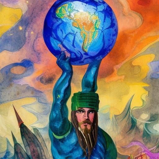 This museum-quality artwork depicts the Atlantean bearing the globe on his shoulders. The image features thick, textured gouache watercolor brush strokes, creating an epic, maximalist impressionist masterpiece.