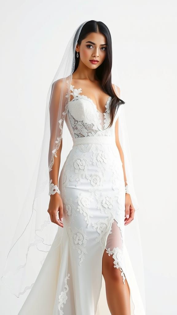 A hyperrealistic, full-body portrait of a young Mexican woman in a minimalist white lace bridal gown and veil. The image features sharp details and a photorealistic finish in pure white light.