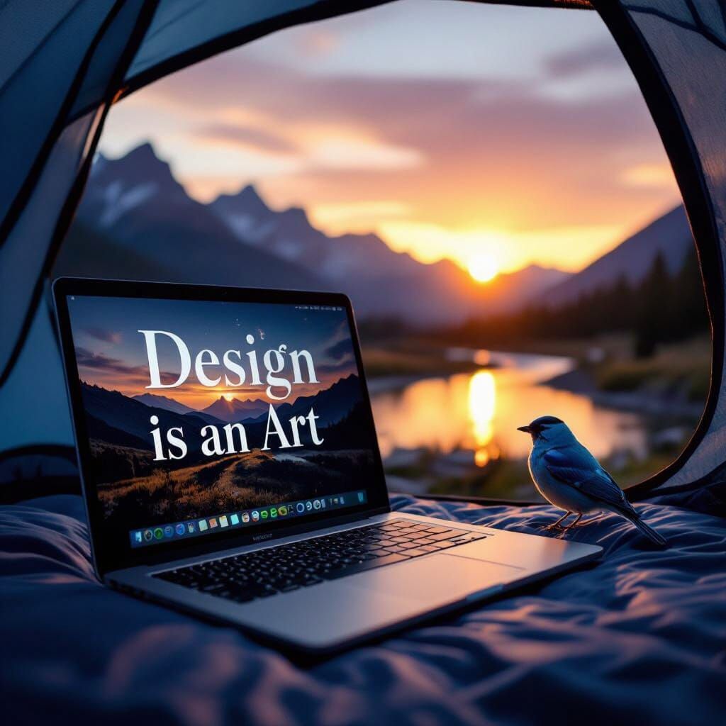 A high-quality DSLR photo shows a laptop displaying "Design is an art" inside a tent. The scene features a golden sunset, mountains, river, and a bird, with sharp focus and bokeh.