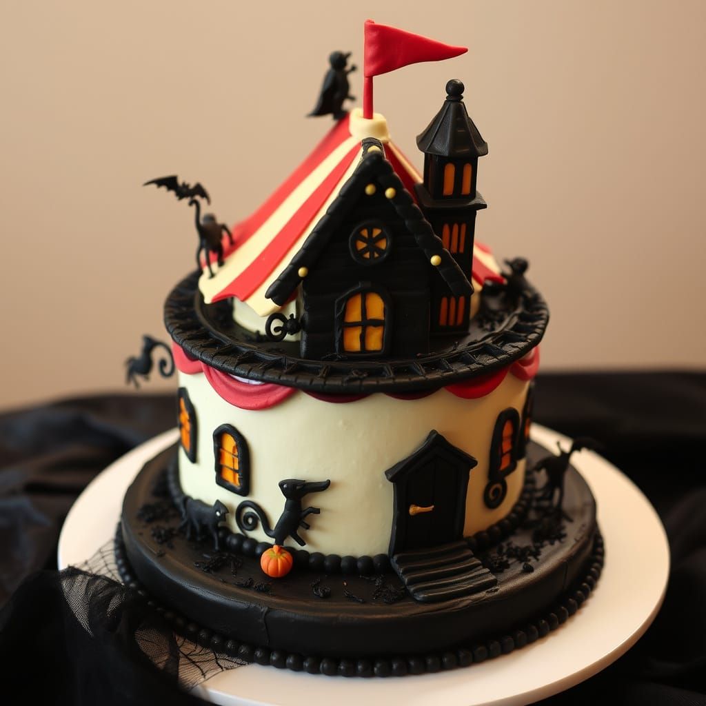 This image depicts a spooky yet festive gathering. A haunted house themed cake is the centerpiece of a circus-inspired party, blending eerie and celebratory elements.