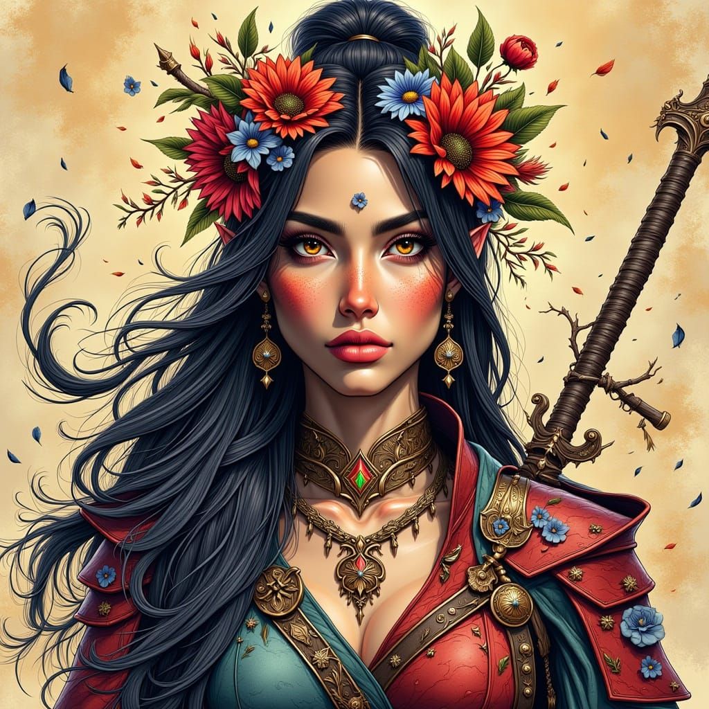 A highly detailed, centered image of a beautiful warrior princess, presented with precise lineart and dramatic lighting in a cinematic style with ink-like washes and floral motifs.