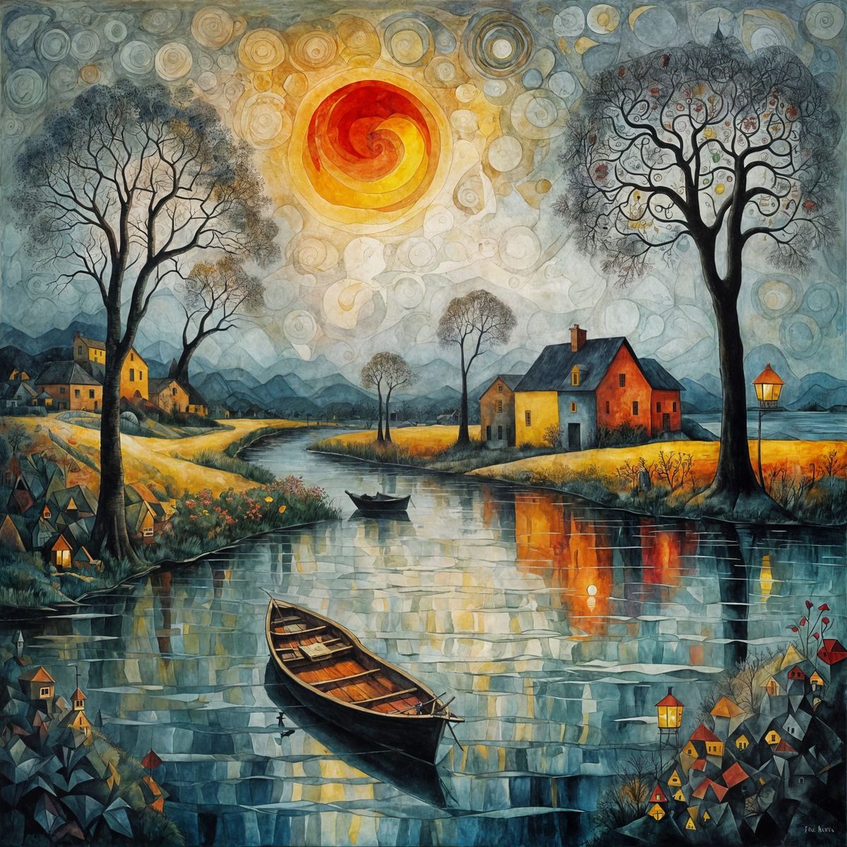 This image showcases a captivating surreal village scene with a winding river, lone tree, and colorful cottages. A blend of dreamlike scenery, bold forms, and whimsical darkness creates a mystique and wonder. Expressive brushstrokes and intricate patterns add to the avant-garde, fantastical atmosphere.