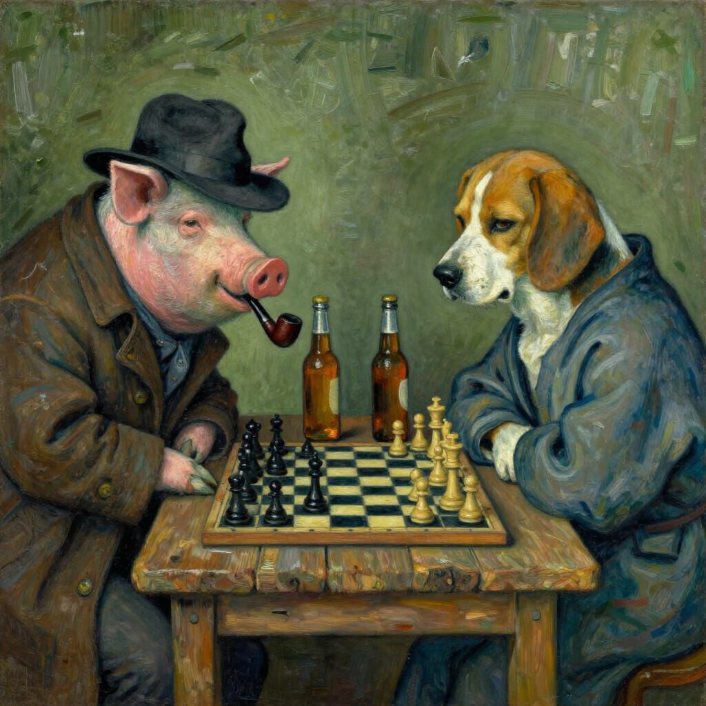 This image shows an intense chess game between an anthropomorphic pig and dog, depicted with thick brushstrokes in a Post-Impressionist style. The scene is illuminated by somber olive-green light, conveying profound silence and intellectual gravity.
