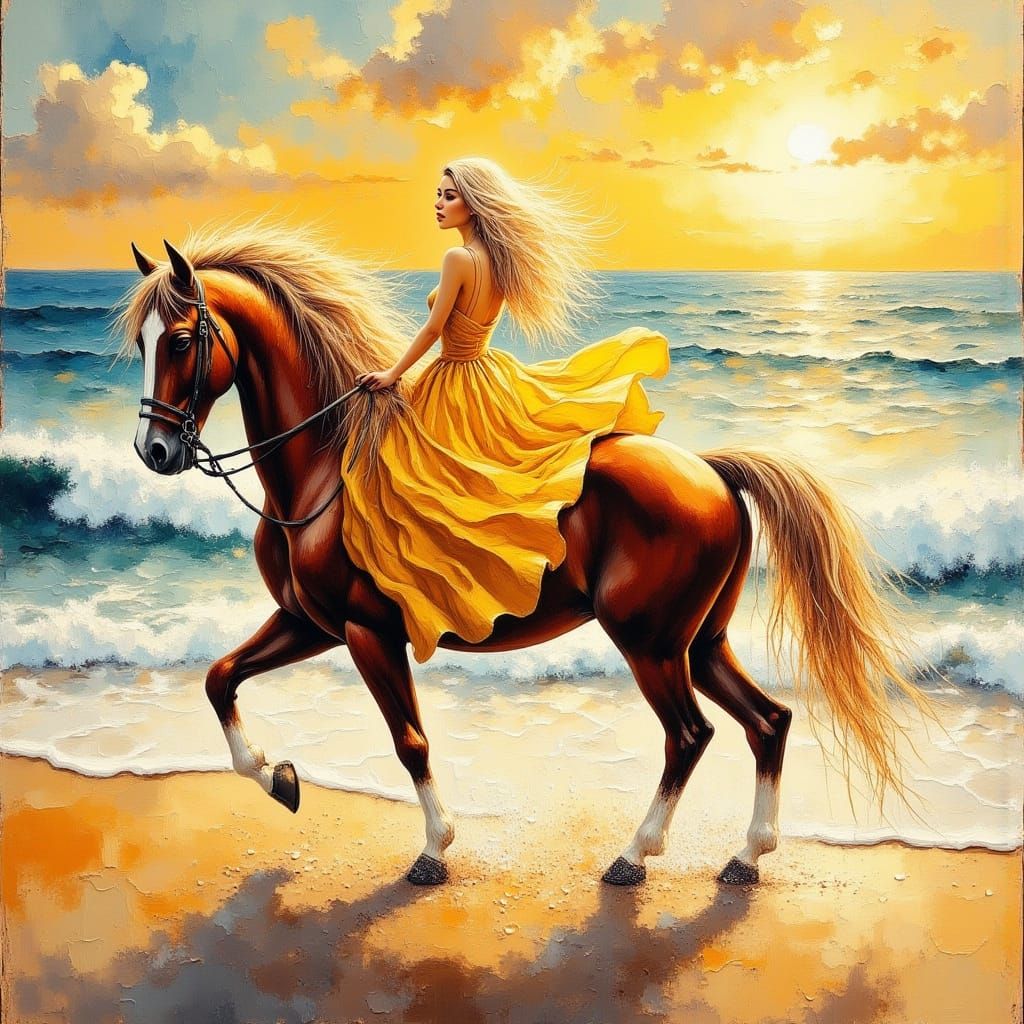 This image depicts a serene scene of a blonde woman riding a horse along a beach at sunset, with the wind whipping her hair into a frenzy, in a dreamy and ethereal impressionist style.