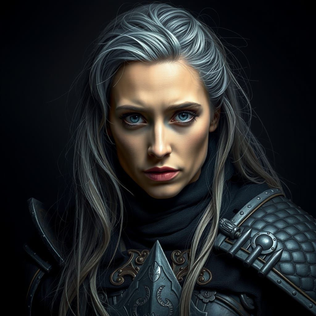 This image shows a stern female knight with long grey hair, clad in dark armor, against a dark background. The portrait evokes a photorealistic, medieval mood.