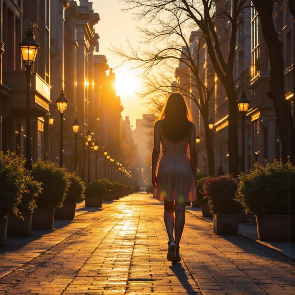 This image shows a woman walking on quiet streets bathed in the warm glow of the golden hour. Sunlight paints her path, creating a serene and peaceful atmosphere.