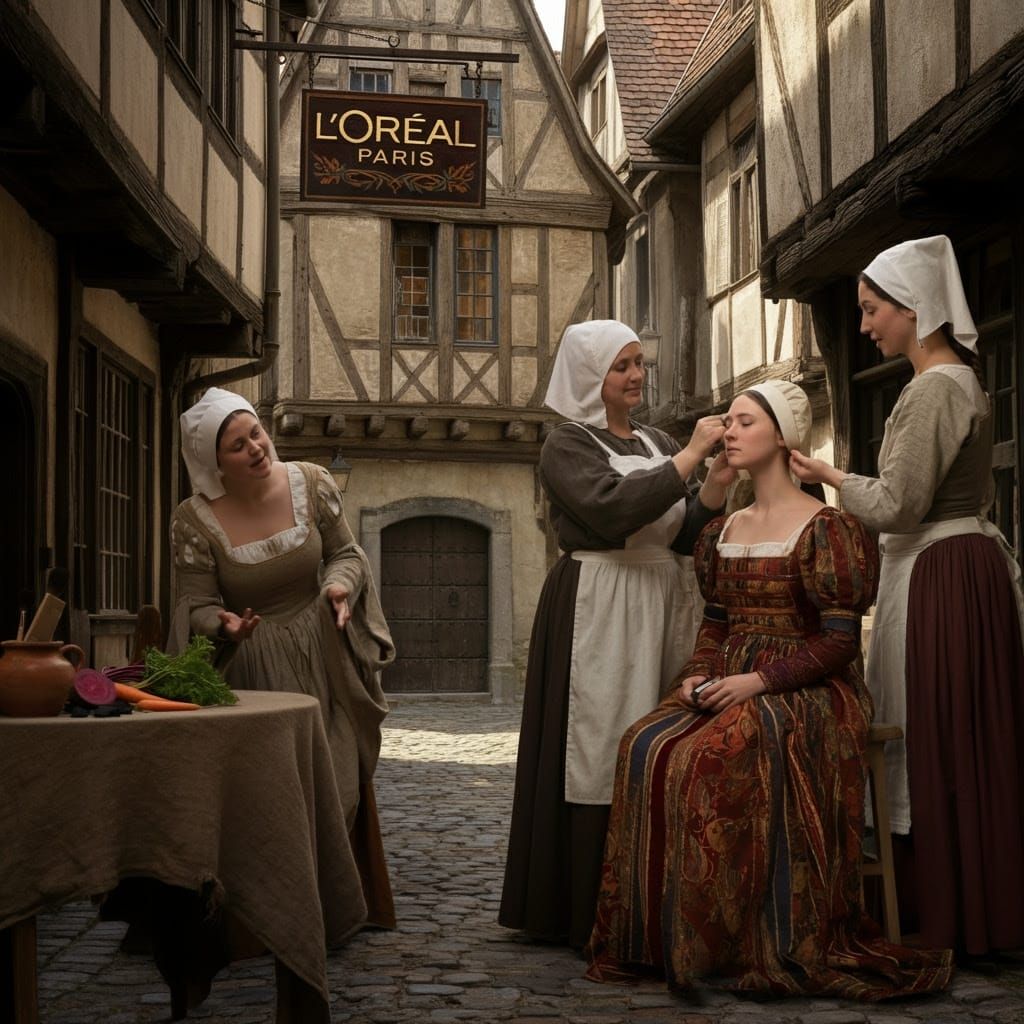 A hyperrealistic digital painting of a bustling 14th-century European town. A bourgeoise woman sits on a stool as her maidservant applies makeup using natural ingredients and medieval cosmetics.
