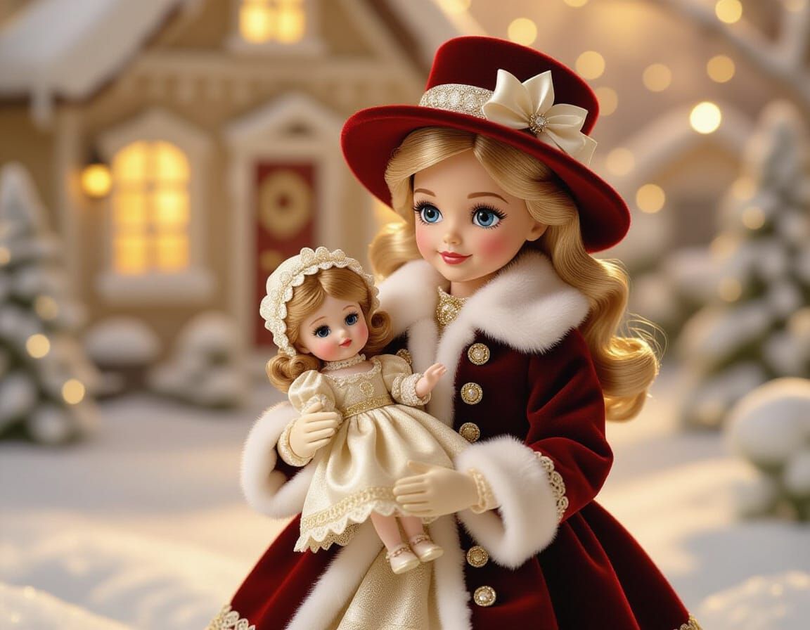 This image shows a Victorian-era Barbie doll holding a porcelain doll in a Christmas scene. The backdrop is snow-covered with warm lighting, intricate textures, and an anime aesthetic.