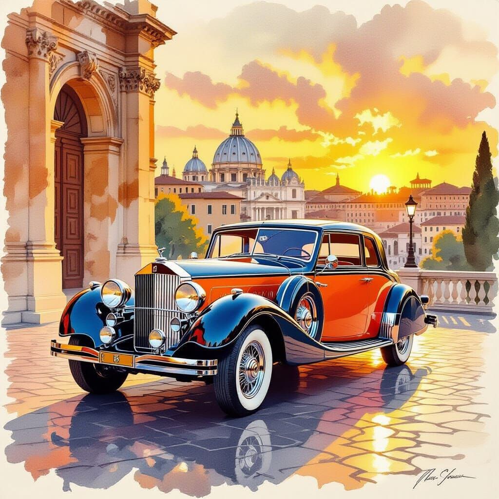 A striking picture of a vintage car at sunrise in Rome. The image showcases golden light casting shadows on the architecture, reminiscent of expressive aquarelle paintings.