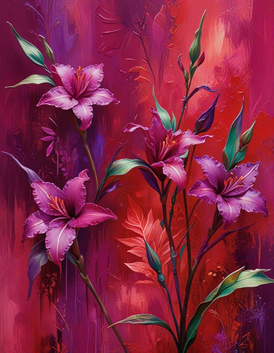 This image shows a close-up of a stunning floral arrangement, with deep magenta and purple gladiolies and green leaves set against a splashy, painterly background in a bold, grunge-inspired palette.