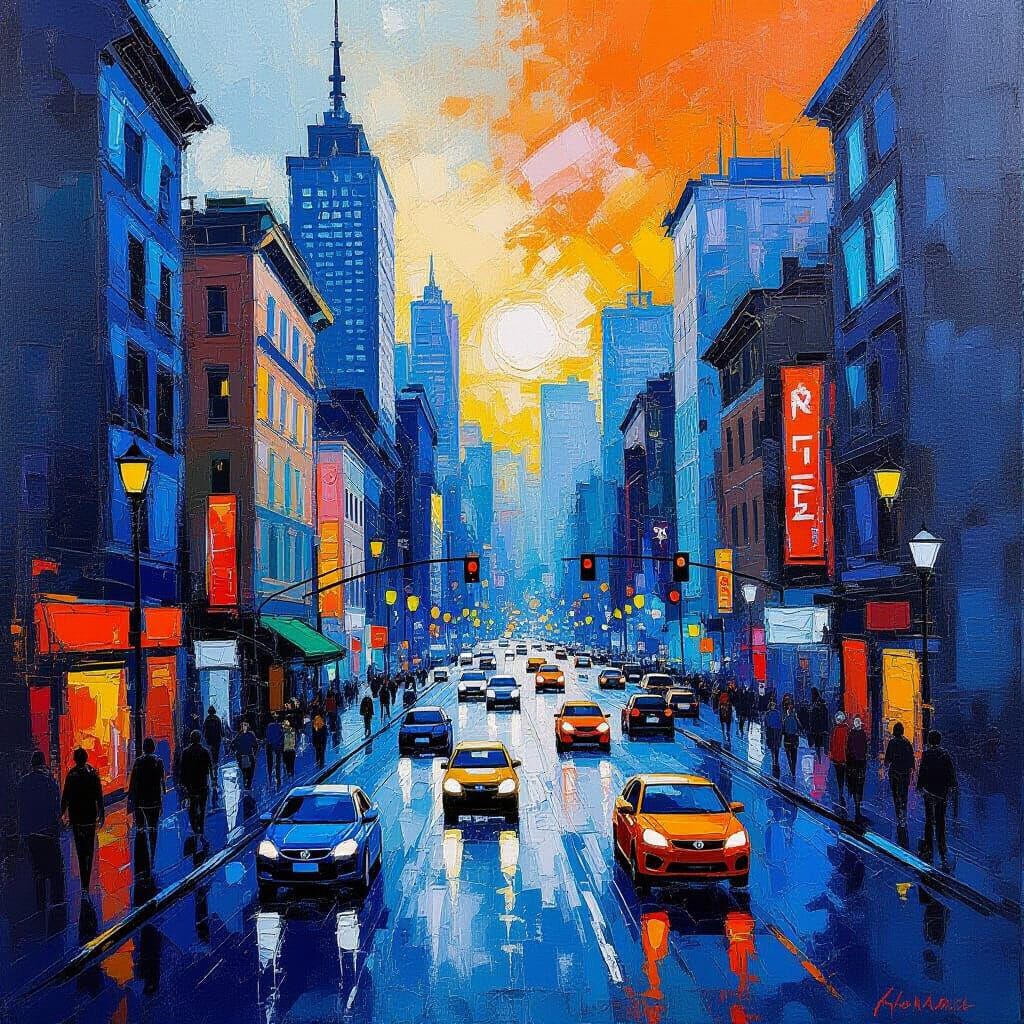 This image depicts a lively city street with colorful buildings, rendered with dynamic abstract expressionist brushstrokes and intricate details in blues and oranges.