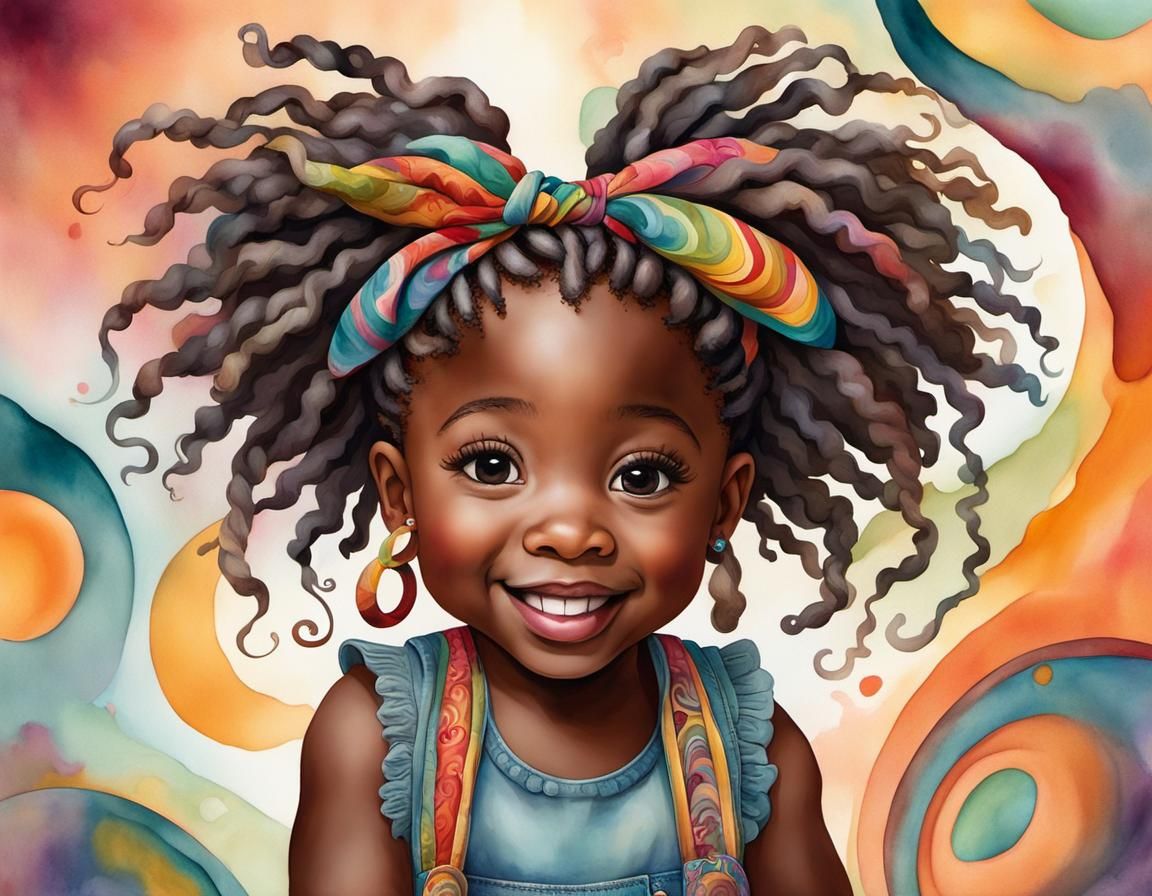 This image shows a cute, funny toddler with locs making a goofy expression. The background features soft, colorful watercolor patterns contributing to a whimsical atmosphere.