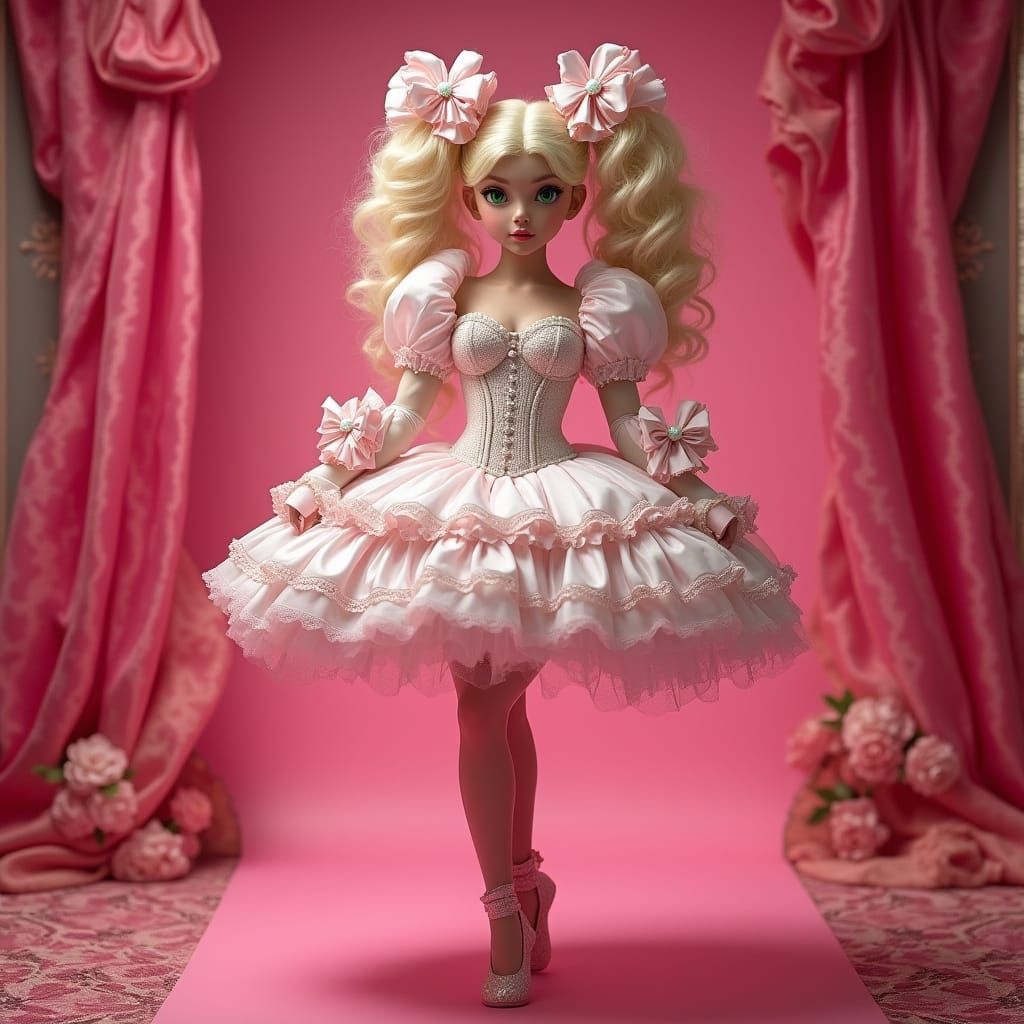 This image shows a beautiful, poofy ballerina on a hot pink stage, surrounded by a frilly, lacey setting. She wears a stunning, oversized ballerina dress with gigantic sleeves and bows, along with curly pigtails adorned with more bows. The overall style is a nostalgic, futuristic blend of synthwave and r...