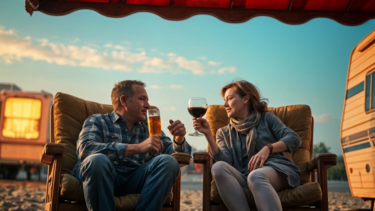 This image shows a middle-aged couple relaxing outside their caravan. The man sips beer while the woman enjoys red wine against a sunset backdrop. The scene is rendered with realistic detail and cinematic lighting.