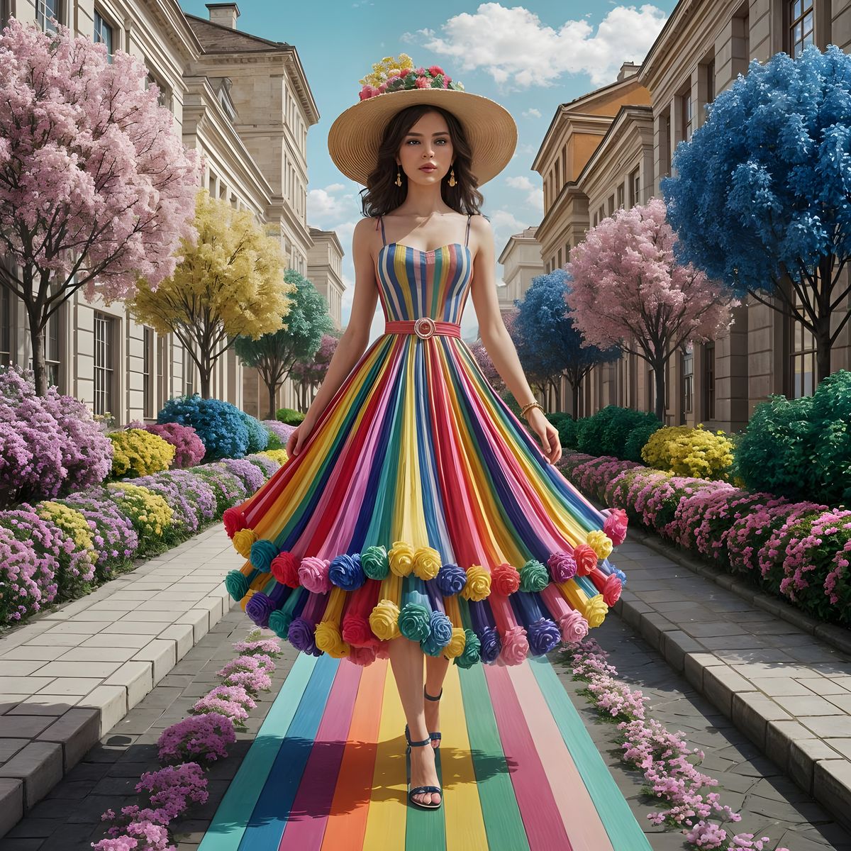 A vibrant 3D rendering of a fashionista in a striped gown on a colorful striped walkway. The image evokes the style of thick brush stroke gouache and impressionist painting.