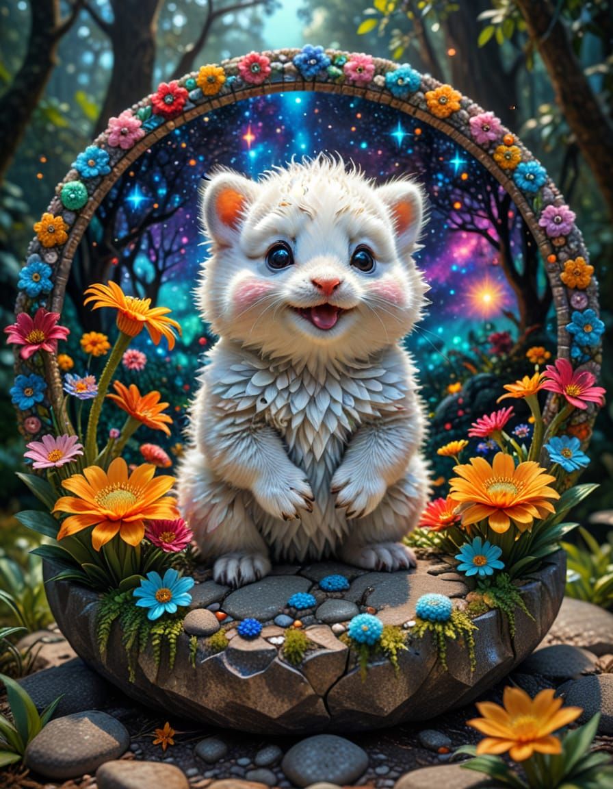 This image depicts a kaleidoscope of geometric designs radiating from the center, mirroring sections of bold shapes in a circular layout. A vibrant and intricate fantasy scene.